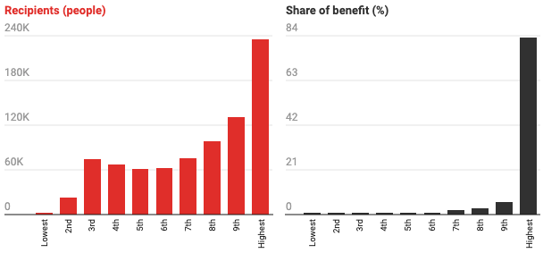 The Treasury’s Tax Expenditure and Insight Statements show that in 2022–23 89% of the benefit went to the top 20% of income earners, with 86% flowing to those in the top 10%. On average, the highest income earners received a benefit of more than $86,000, while those in the bottom 60% received around $5,000.